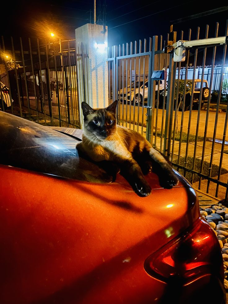 Kap mobil yang hangat sering jadi arena peregangan setelah bangun tidur.